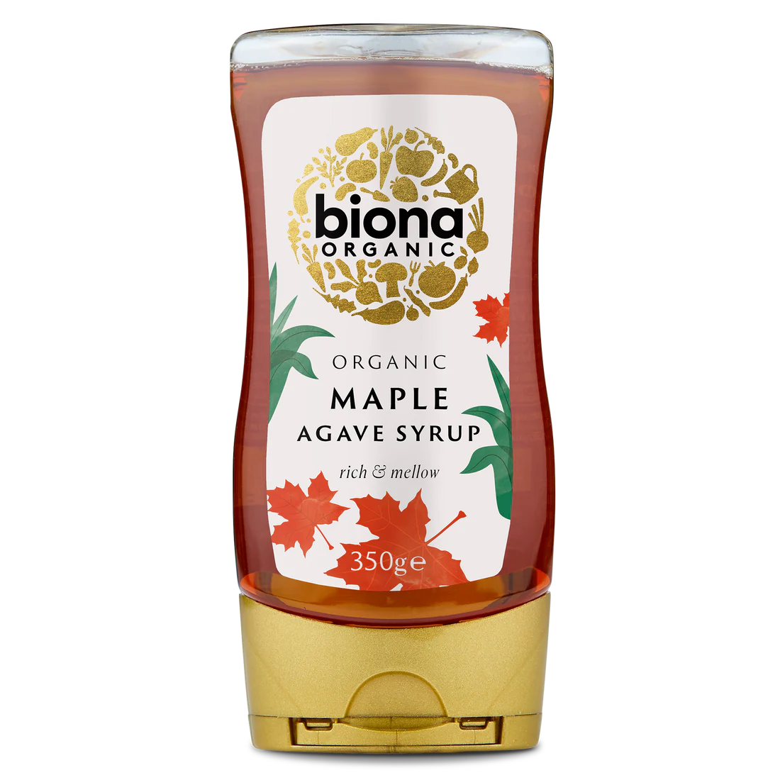 Organic agave syrup with 20% pure maple syrup. Rich and mellow, delicious with pancakes or ice cream.