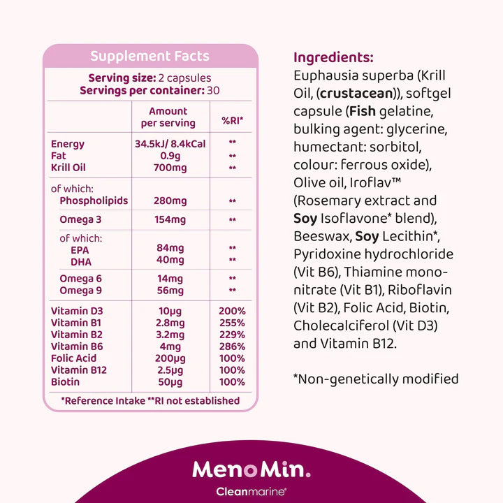 Cleanmarine MenoMin contains both Vitamin B2 and biotin that contribute to the maintenance of normal mucous membranes which line the vagina and other parts of the body including the mouth. While Omega 3 fatty acids, DHA and EPA, from krill oil and vitamin B1 contribute to the normal function of the heart.