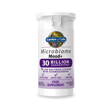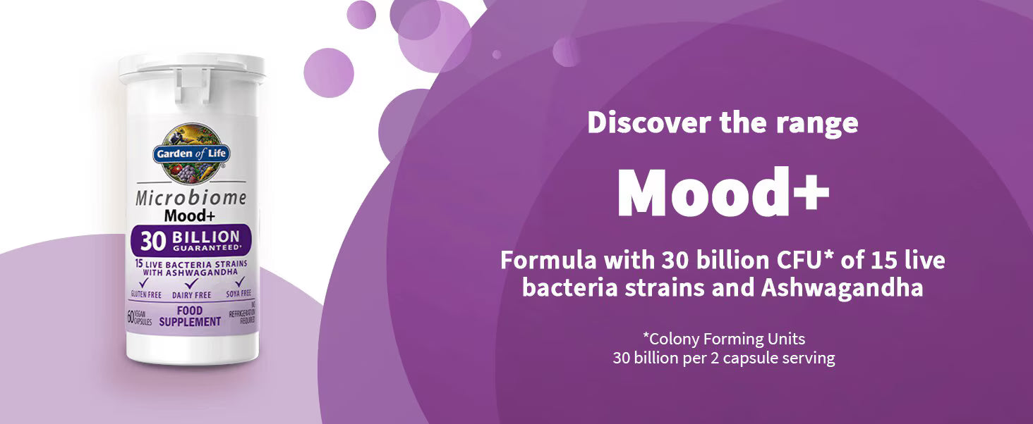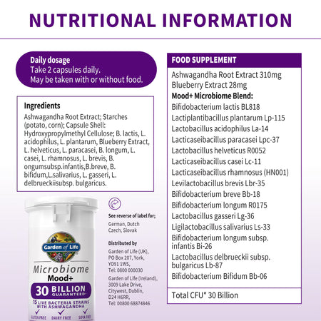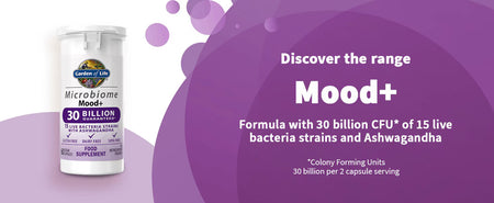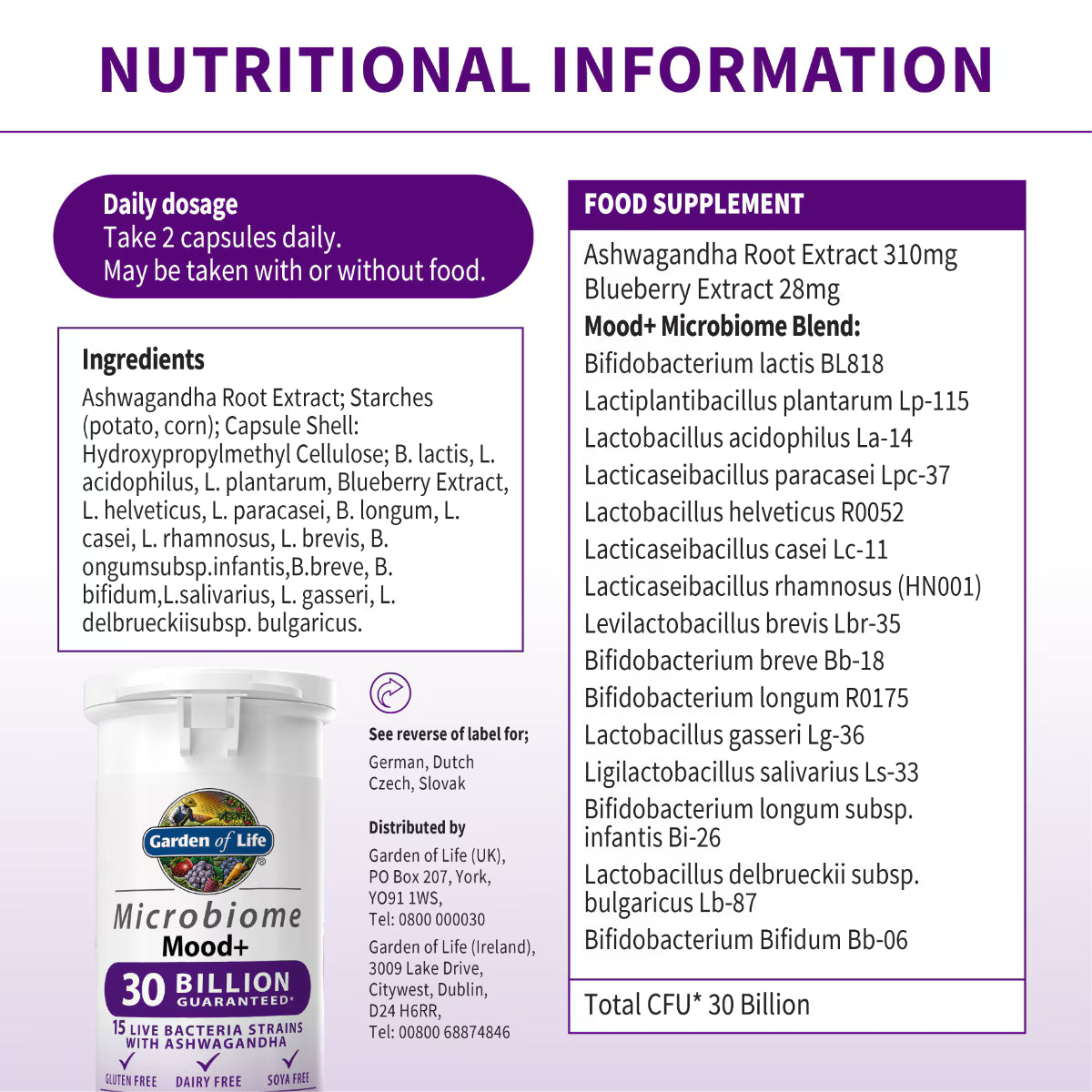 Discover the power of Microbiome supplements with Garden of Life Probiotic Microbiomes Mood+ Microbiomes for Women and Men, in just 2 capsules. Our microbiome supplement contains a blend of Ashwagandha and Blueberry extract. Mood+ formula contains a potent mix of carefully selected live bacteria which delivers 30 billion CFU per capsule, and will survive stomach acid and bile. The shelf-stable formula contains no carriers, fillers, artificial colours, flavours, sweeteners or preservatives.