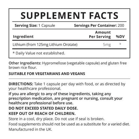 Lithium Balance™ is a trace mineral found in several foods, like whole grains and vegetables. Supplementation with this mineral is an option to support optimal levels. Lithium helps strengthen nerve cell connections in the brain that regulate mood, cognition and behaviour. Orotate is an organic carrier that transports natural lithium easily across the blood-brain barrier. Combining organic lithium with orotate often makes it more effective than the inorganic chemical form and is without any known side effects.