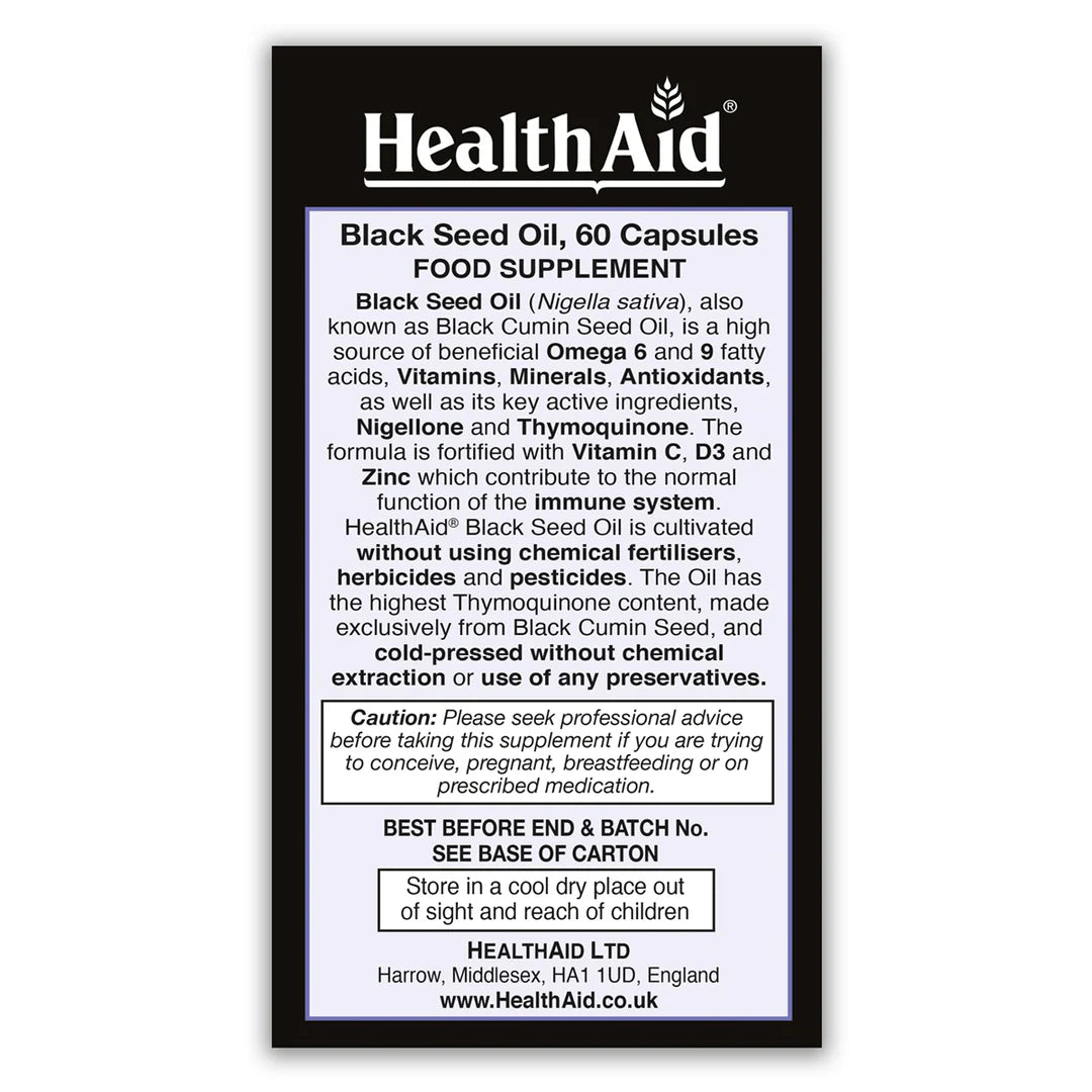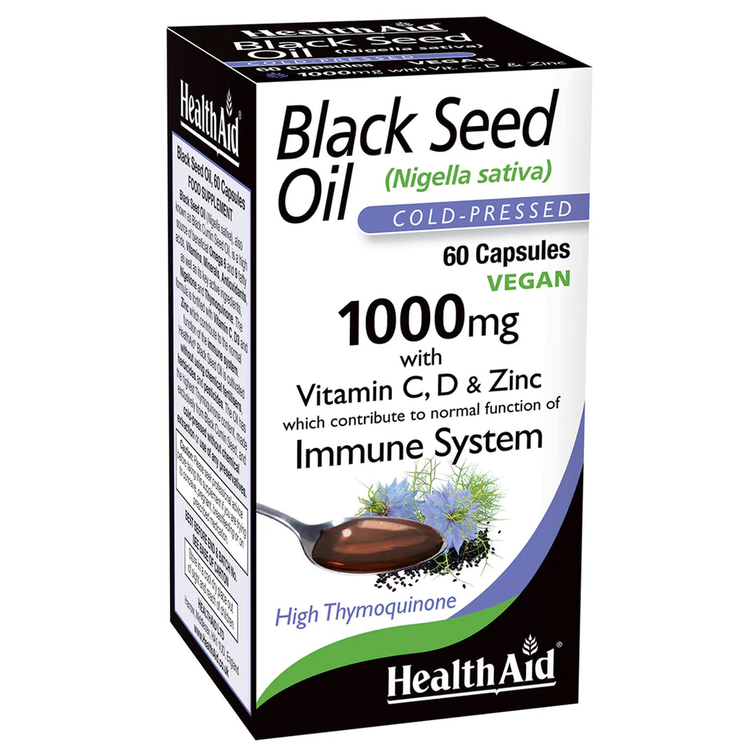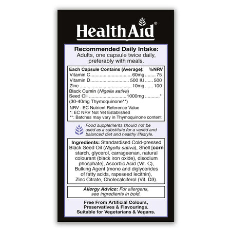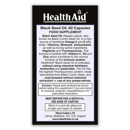 Black Seed (Nigella sativa) is an ancient Indian spice known as ‘Kala Jira’, a flowering plant which grows in Southwest Asia and the Middle East. HealthAid® Black Seed Oil is exceptionally high in Thymoquinone. Thymoquinone is the key active ingredient of Nigella sativa and is responsible for its numerous health benefits, such as supporting the immune system by promoting immune cell activity. It might also have positive effects on respiratory and digestive health. Black seed Oil is believed to support overall cardiovascular function.