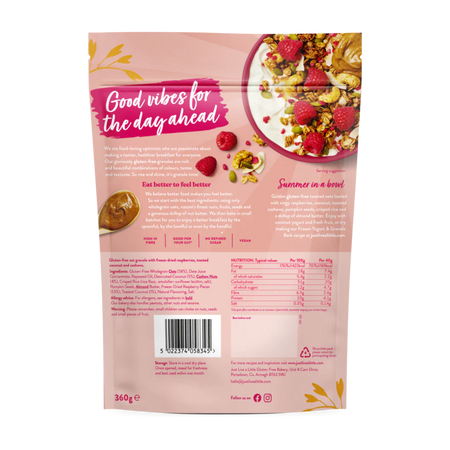 Gluten-Free Wholegrain Oats (58%), Date Juice Concentrate, Rapeseed Oil, Desiccated Coconut (5%), Cashew Nuts (4%), Crisped Rice (rice flour, emulsifier: sunflower lecithin, salt), Pumpkin Seeds, Almond Butter, Freeze-Dried Raspberry Pieces (1.5%), Toasted Coconut (1%), Natural Flavouring, Salt.