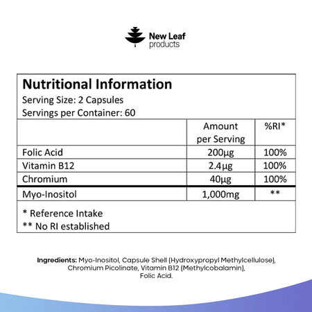 Myo-Inositol, Capsule Shell HPMC, Chromium Picolinate, Folic Acid, Vitamin B12 (Methylcobalamin).
